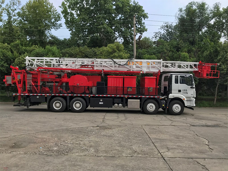 網(wǎng)電儲(chǔ)能修井機(jī)是一種符合國(guó)家能源產(chǎn)業(yè)政策和綠色環(huán)保的電動(dòng)直驅(qū)自動(dòng)化修井裝備,采用重載二類底盤,車上安裝180kW電動(dòng)直驅(qū)絞車,主剎車為能耗制動(dòng),輔助剎車為氣動(dòng)盤剎;車上還配有電控柜及儲(chǔ)能動(dòng)力電池組,接入30~50KVA井場(chǎng)電網(wǎng);車尾部集成安裝有旋轉(zhuǎn)司鉆房、自動(dòng)液壓鉗、扶正機(jī)械手等自動(dòng)化設(shè)備,井場(chǎng)配套有折疊式動(dòng)力貓道和動(dòng)力排管架,司鉆控制系統(tǒng)具有數(shù)據(jù)采集、遠(yuǎn)傳及診斷功能。